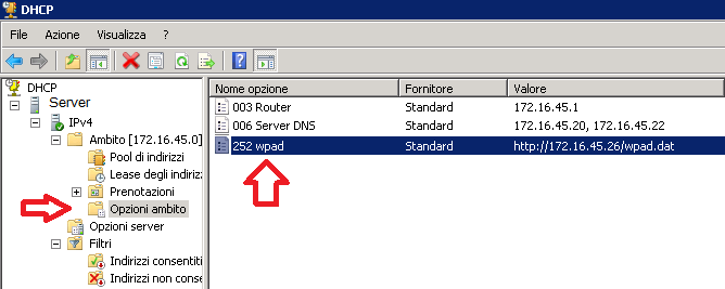 Nelle impostazioni del DHCP aggiungere un opzione ambito del tipo 252 indicando un indirizzo http://172.16.45.26/wpad.dat così come indicato qui.