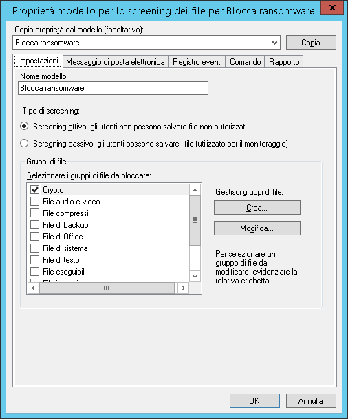 Poi nella sezione Gestione screening dei file -> Modelli per lo screening dei file aggiungere un nuovo modello “Blocca ransomware” con le opzioni indicate nella figura 3