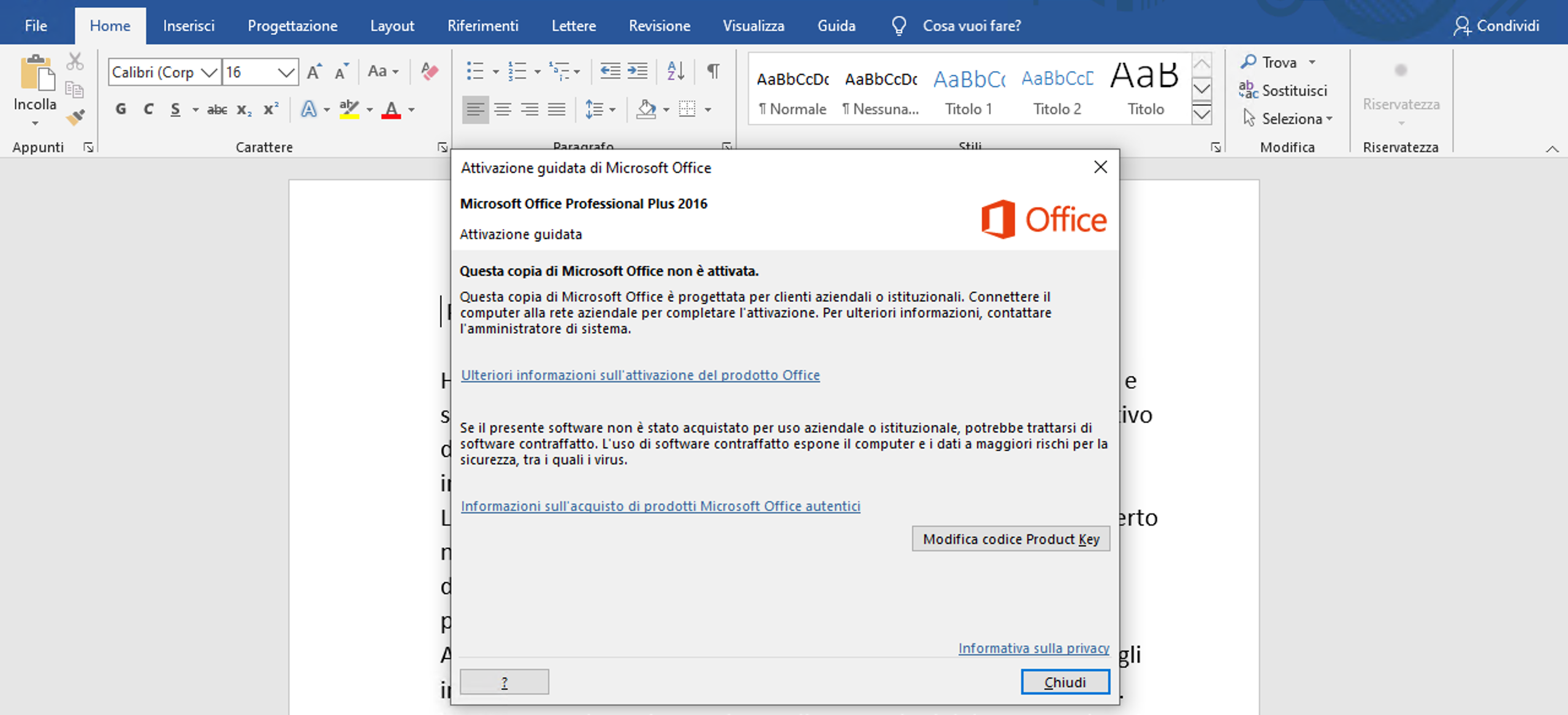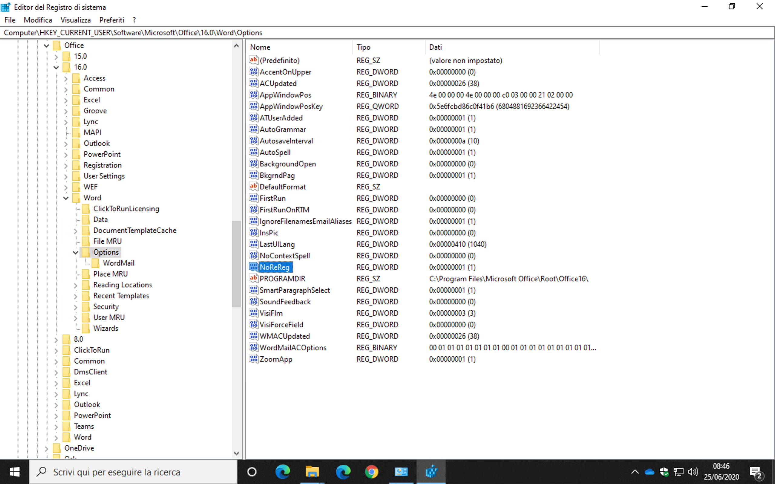 Attenzione: l’operazione deve essere svolta prima di aprire ognuna delle applicazioni di Office (Word, Excel, PowerPoint, Outlook, ecc.)