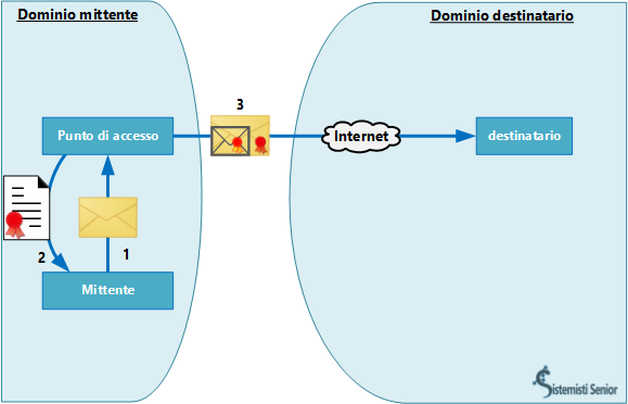 Tra due utenti dotati di posta elettronica certificata il percorso di invio e ricezione del messaggio è mediato e garantito dai provider accreditati dal CNIPA (Centro Nazionale per l’Informatica nella Pubblica Amministrazione http://www.cnipa.gov.it/site/it-IT/) che regolano la PEC. Il mittente invia il suo messaggio (1a) e riceve la ricevuta di accettazione (1b), nel momento in cui il messaggio viene preso in carico dal suo provider. Il messaggio viene inviato in maniera protetta e assicurata dal provider del mittente a quello del destinatario tramite una busta di trasporto (2a) virtuale sigillata. In fase di ricezione dal provider del destinatario viene inviata al mittente la ricevuta di consegna (2b). Allo stesso tempo il provider del destinatario consegna il messaggio al destinatario (4a). A questo punto il messaggio è disponibile nella casella del destinatario. (5) Ogni messaggio viene catalogato con codice identificativo conservato per legge per 30 mesi. Il contenuto può essere salvato inoltre nell’archivio di sicurezza (fino a raggiungimento limite spazio di 1 GB).