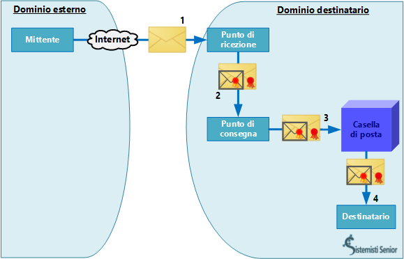 I messaggi di posta certificata che non vengono riconosciuti come tali dal provider del destinatario (punto di ricezione) vengono trattati come messaggi di posta non certificata. Quando il messaggio non certificato perviene ad un provider di posta certificata (1) il punto di ricezione non riconosce le caratteristiche del messaggio di posta certificata e quindi crea un messaggio di anomalia (2), firmato digitalmente, a cui allega il messaggio ricevuto. Il messaggio di anomalia viene inoltrato al punto di consegna (se diverso dal punto di ricezione). Il messaggio di anomalia, a cui è allegato il messaggio ricevuto, viene depositato nella casella del destinatario, (3) che può visualizzare il messaggio di anomalia contenente il messaggio originale. (4)